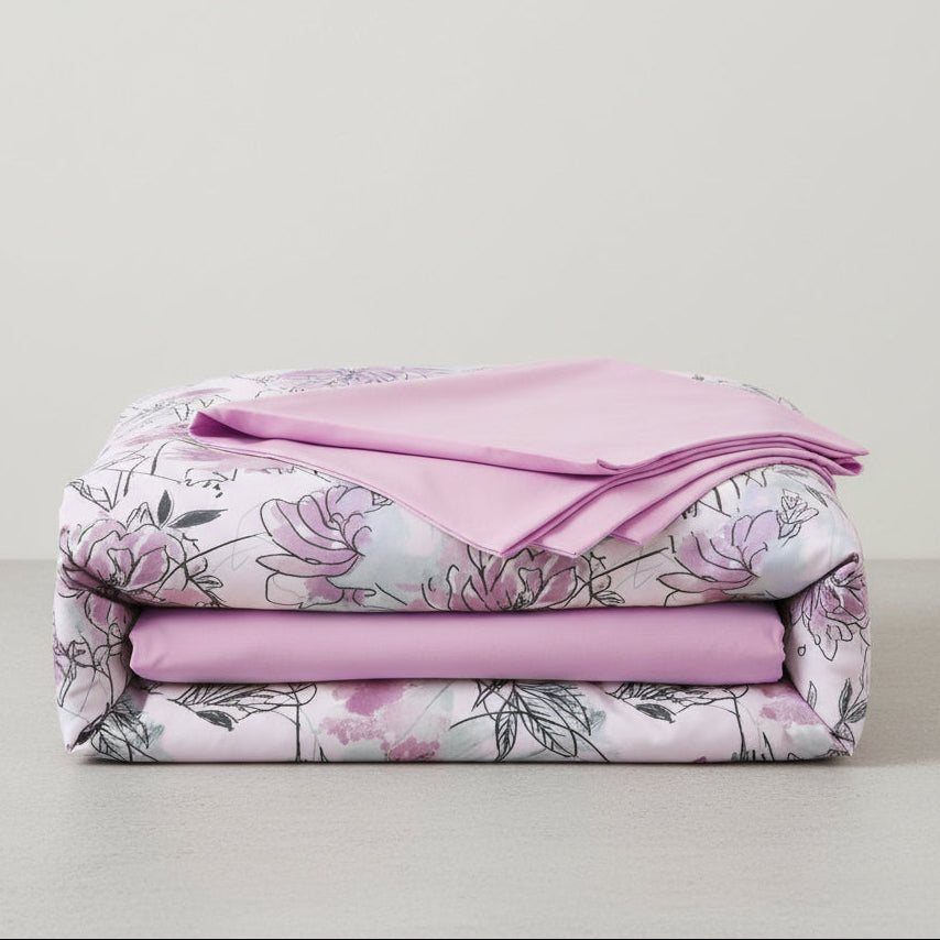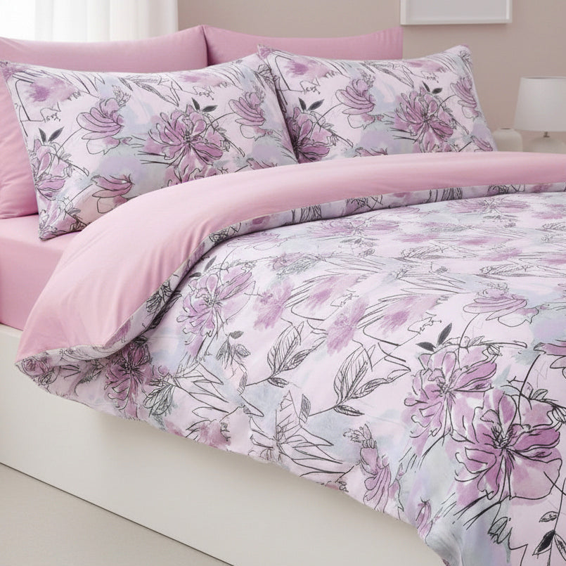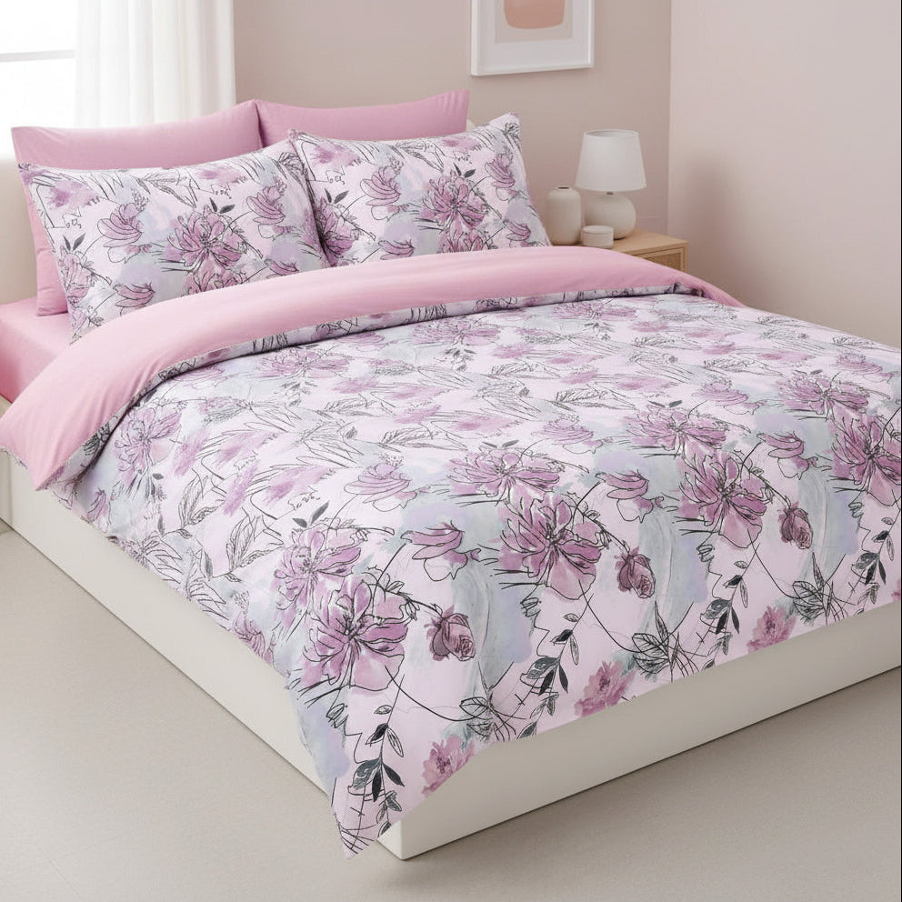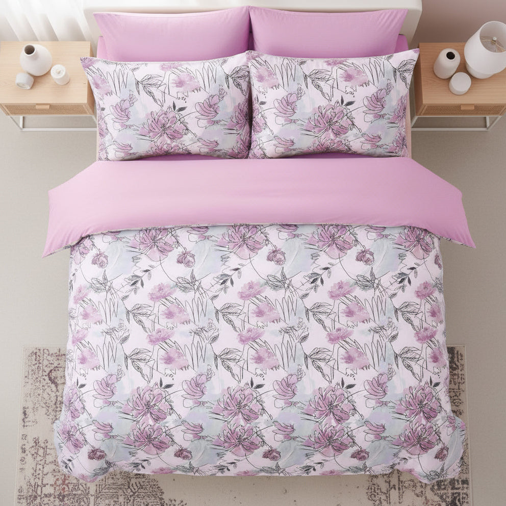 Infuse your space with Anelia from our Luxury Printed Collection featuring a unique floral design paired with a matching pink sheet, perfect for adding personality to any bedroom.