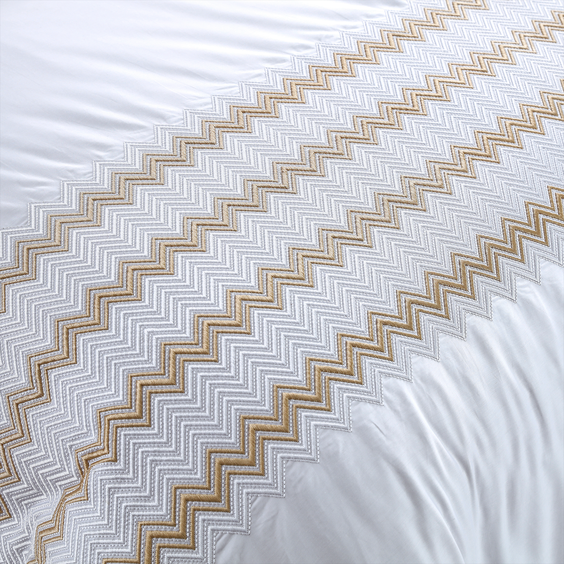Revamp your bedroom with a fresh and stylish look of Chevron Weave from our Hotel collection, featuring a clean white base accentuated by stunning embroidery in beige and white colored chevron patterns.