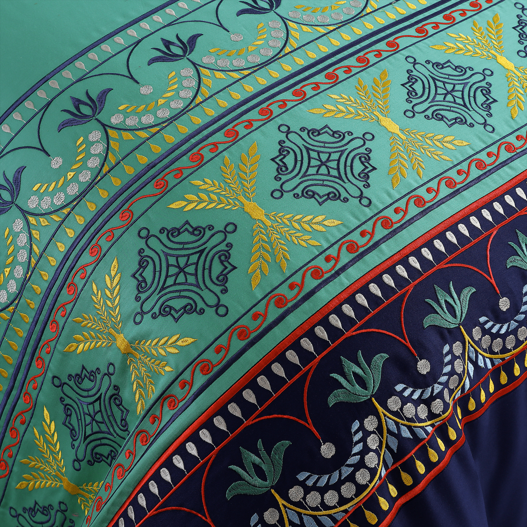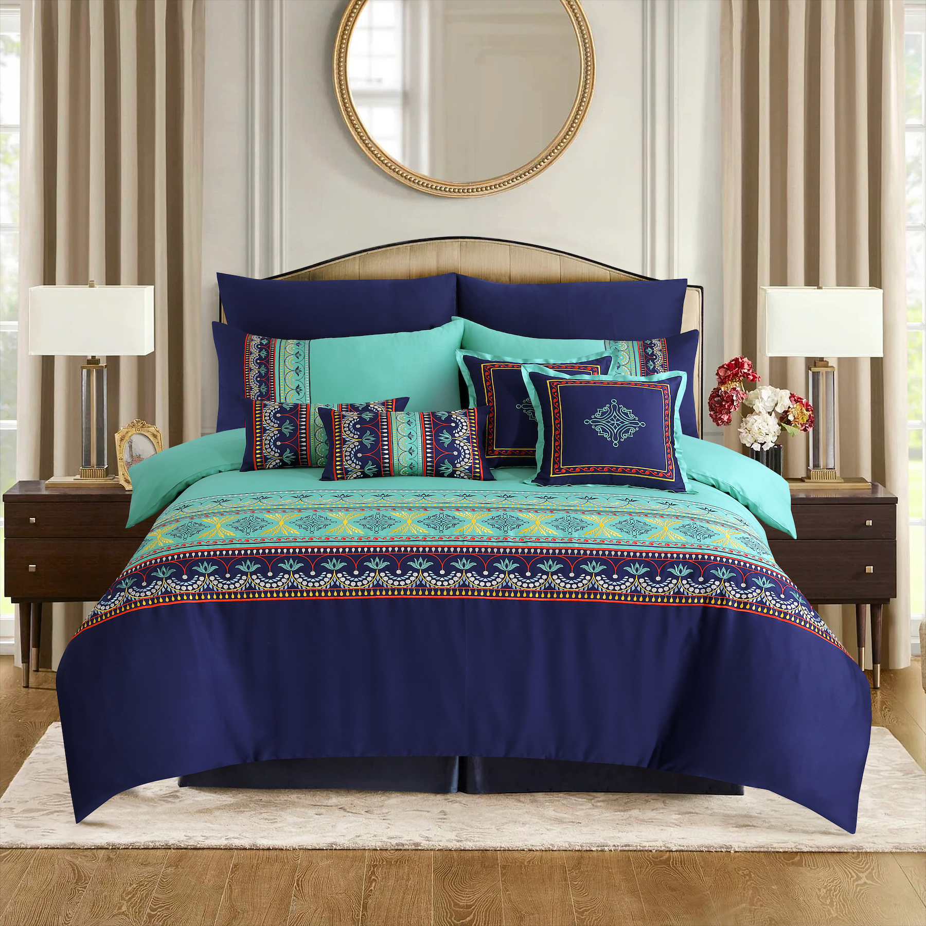 Create a harmonious and contemporary bedroom look with Continental from our Luxury Embroidered Collection, featuring a fusion of turquoise and navy colored fabrics complemented with a unique, multi colored embroidered pattern.